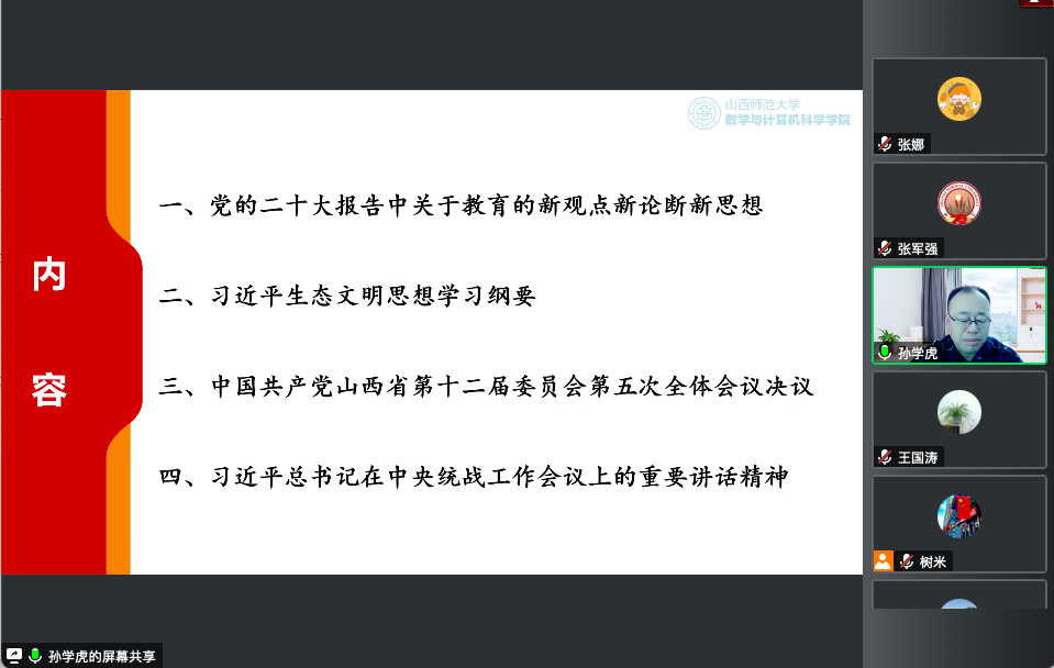 公司党委书记孙学虎专题领学了党的二十大报告中关于教育的新观点、新论述、新思想以及《习近平生态文明思想学习纲要》,学习了《中国共产党山西省第十二届委员会第五次全体会议决议》及习近平总书记在中央统战工作会议上的重要讲话精神。