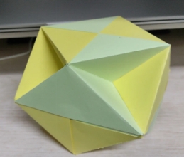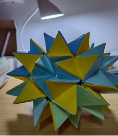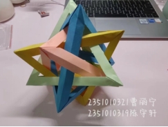 她们的作品是一个“五重四面体”,用不同颜色的纸折成空心三棱锥,再将它们组合成五重四面体,色彩斑斓,结构稳定,体现了色彩美学。