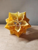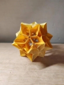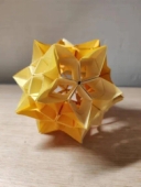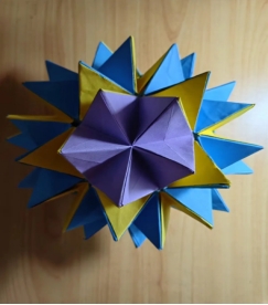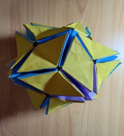 她们的作品名叫纸质绣球花。其作品共有十二个面,每个面是由菱形构成的五边形,这种排布方式使作品看起来整齐美观,作品蕴含着数学中的对称美,同时也体现了她们丰富的想象力和创造力。
