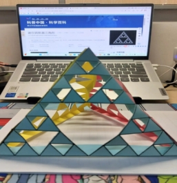 该团队的作品是一个谢尔宾斯基三角形,它是由大的正三棱锥拆分形成,展现了同学们对数学的热爱,传递了数学的魅力。