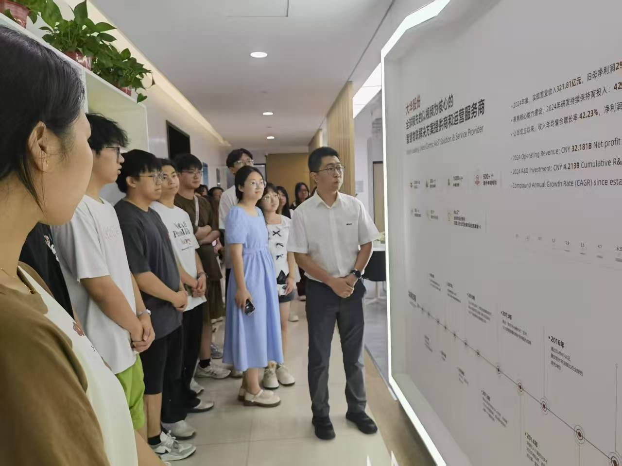 在大华技术股份有限公司,同学们更是大开眼界。同学们分批进入公司展厅,各种先进的智慧物联设备映入眼帘。有能实现精准人脸识别的安防摄像头,有智慧社区管理系统。工作人员现场演示了这些设备的功能,同学们听得津津有味,不时拿出手机拍照记录,大家都收获满满。