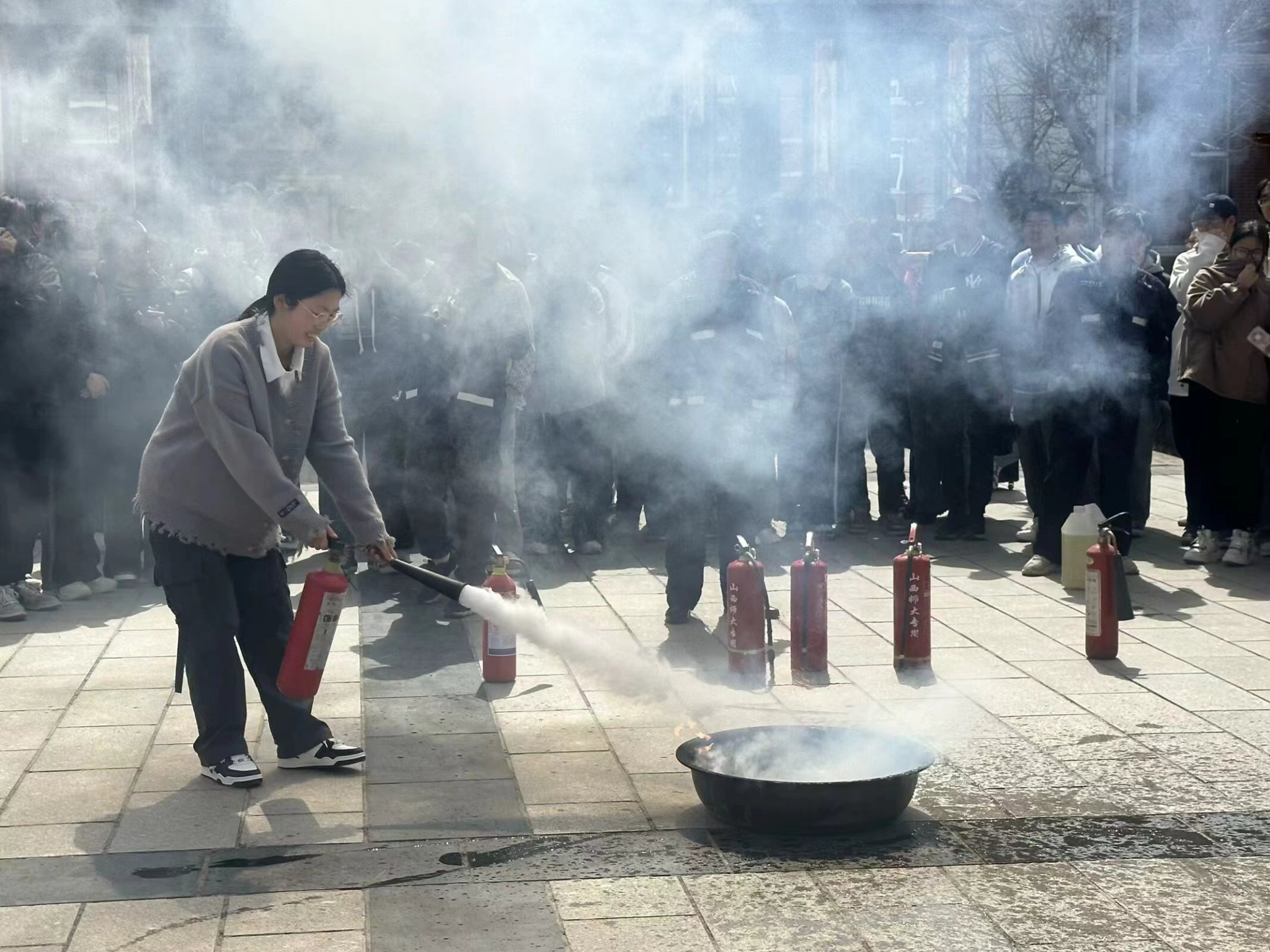 在灭火环节,保卫部消防科老师展示了灭火器的正确使用方法,并指导同学们进行实际操作。大家纷纷上前尝试,通过亲身实践,更深入地了解到灭火器的性能和用途。灭火结束后,同学们积极向消防科老师请教灭火器材的相关问题,老师们耐心解答,大家受益匪浅。