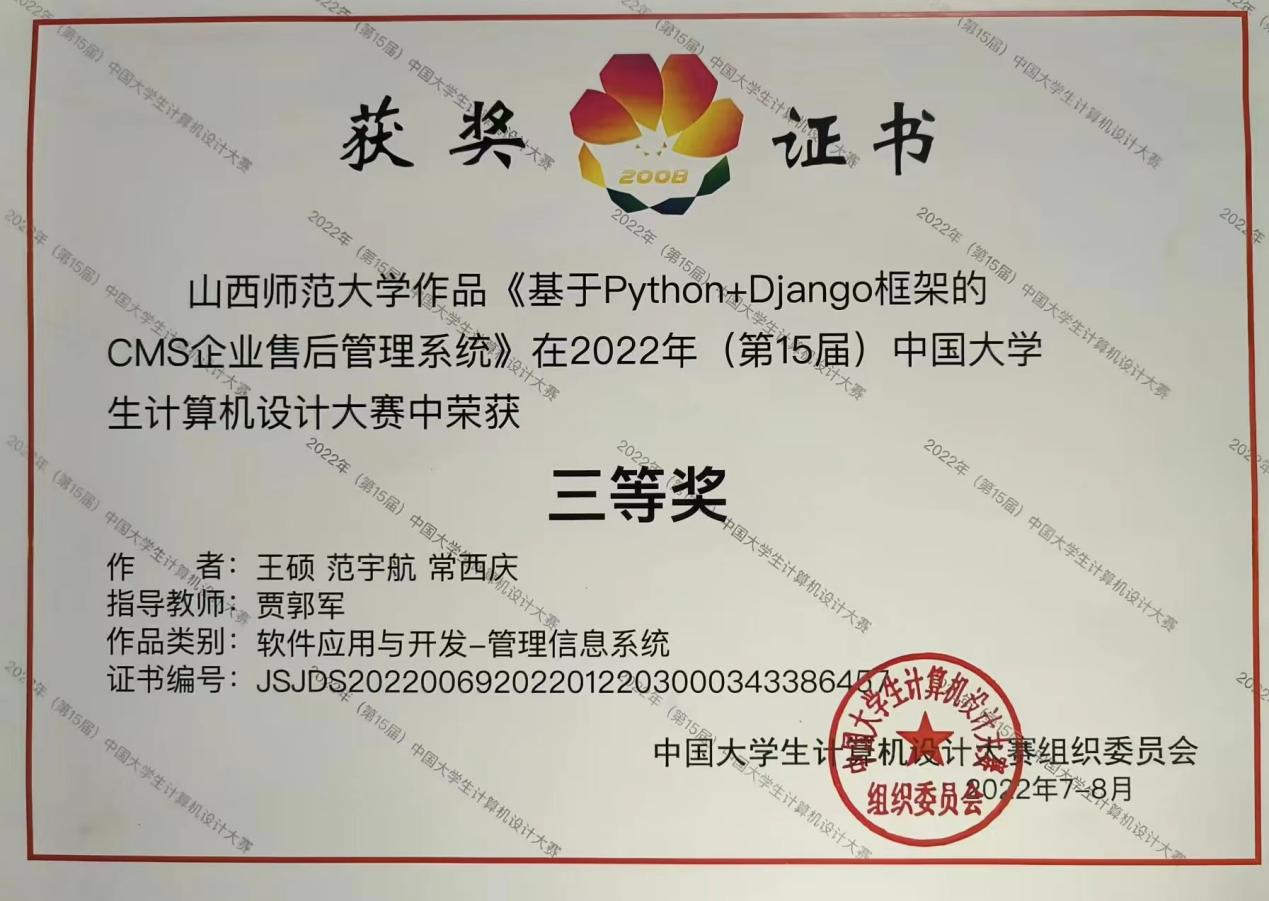 近日,在2022年(第15届)中国老员工计算机设计大赛中,vsport官方网站参赛队伍的软件开发与应用组作品《基于Python+Django框架的CMS企业售后管理系统》荣获山西赛区二等奖、全国三等奖。