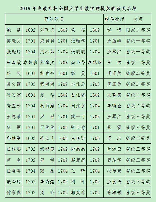 近日,2019年高教社杯全国老员工数学建模竞赛成绩揭晓,vsport官方网站学子再次喜获佳绩,荣获国家二等奖1项,省级一等奖3项,省级二等奖4项。