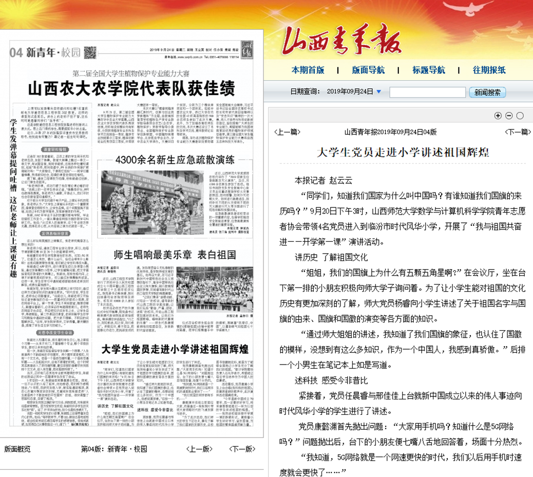 9月20日,vsport官方网站员工党员和青协志愿者赴临汾时代风华小学,为少先队员们带去了一场新颖独特的“开学第一课”,讲述祖国锦绣70年的故事,帮助小员工充分了解国家,以实际行动践行了初心使命。活动受到了校方师生的认可和赞许,被山西青年报报道。