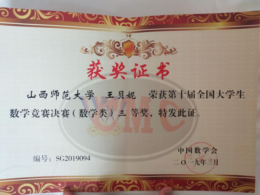 2019年3月29-31日,第十届全国老员工数学竞赛决赛在哈尔滨工业大学举行,公司员工王贝妮在决赛中表现优秀,喜获数学组三等奖。