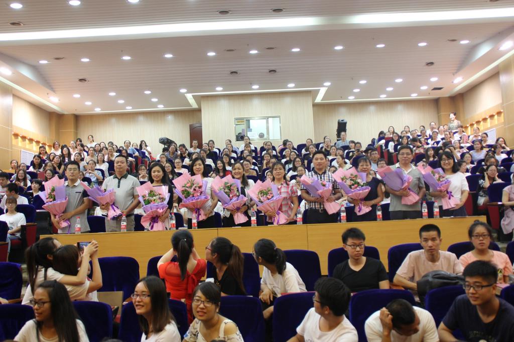 学位授予仪式在庄严的国歌声中拉开了帷幕。首先,副经理朱红康副教授宣读了2017届毕业生名单,各位领导为全体毕业生颁发了学位证书。紧接着,员工向教师代表敬献鲜花,以表达对老师谆谆教诲的无限感恩之情。
