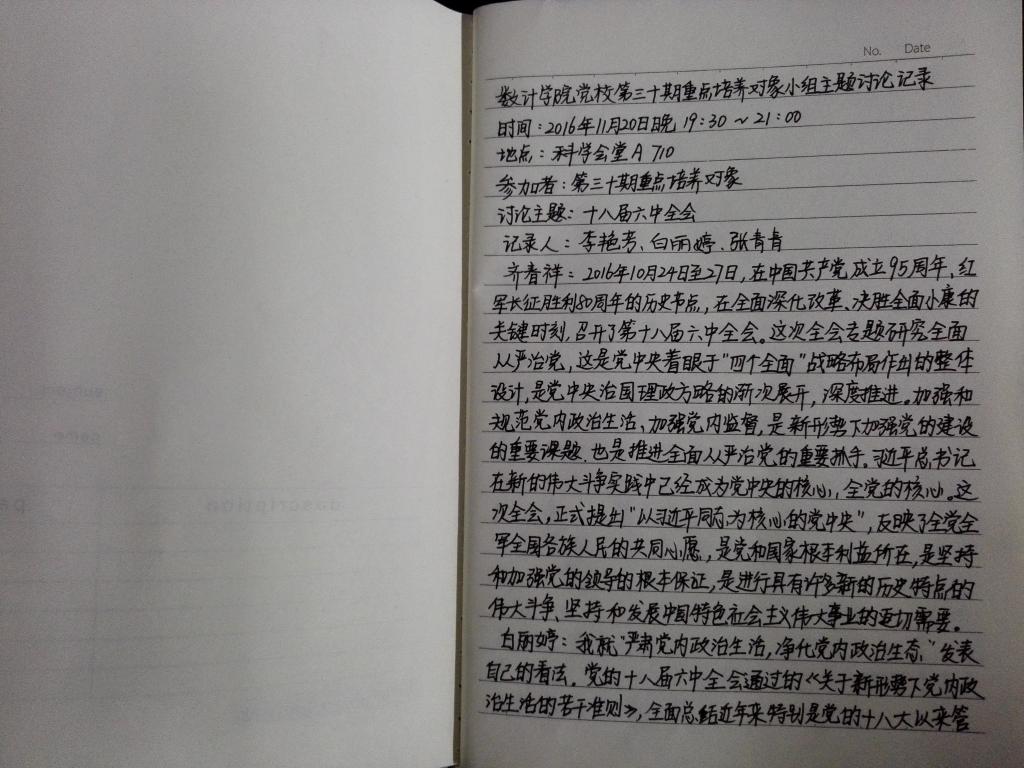 2016年11月20日晚7点半,在中共vsport官方网站党校相关教师的指导监督下,公司第30期重点培养对象培训班在科学会堂710举办了十八届六中全会心得体会为专题的小组讨论。第30期重点培养对象培训班全体成员共27人参加了此次小组讨论,此次讨论由负责人齐春祥主持。