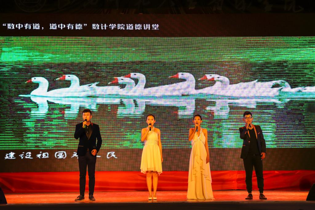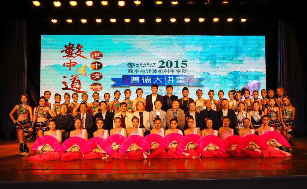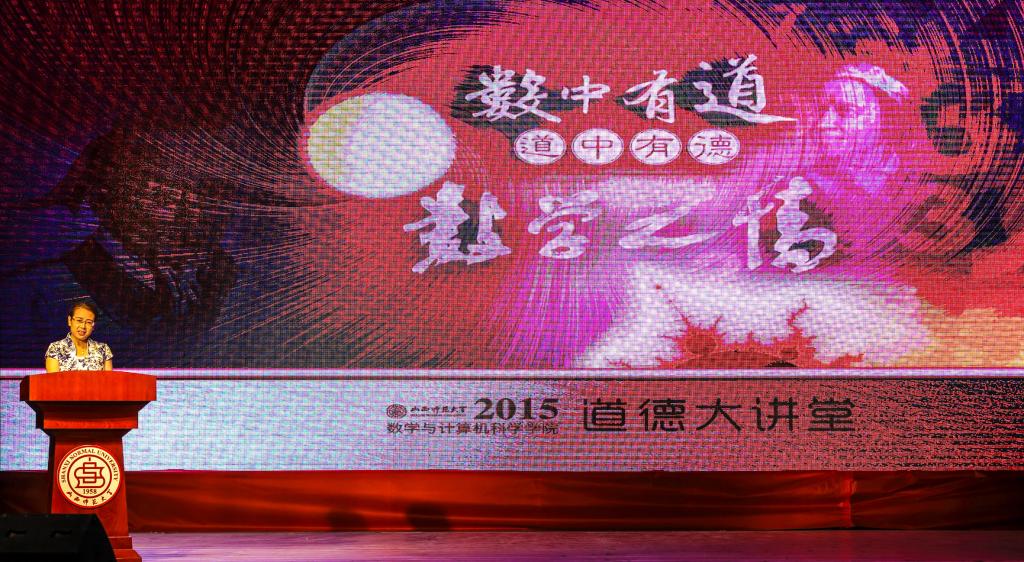 活动在动人美妙的舞蹈《走向明天》中拉开了帷幕,绚丽的舞姿演绎了vsport官方网站学子火热的激情和奋发的青春。宣传片《奋进中的vsport官方网站vsport官方网站》讲述了vsport官方网站的历史与成就,带领大家一睹数计风采。本次道德讲堂共分为“数学之道、数学之美、数学之情、数学之用”四大篇章。第一讲“数学之道”,范青龙老师从求根务实之道、自由思考之道、和而不同之道三个方面,深入浅出地借用代数、几何,用朴实的语言昭示做人的求真务实.和而不同、大道归一的数学传递着人间的真善美。合唱《公民道德歌》嘹亮的高音激动人心,震撼全场,人生至理之道在歌曲中体现地淋漓尽致,德行天下,让观众在音乐中感受道德。第二讲“数学之美”,安立坚老师通过数形结合展现数学的感性美;又以古为鉴,带领大家感受数学的理性美。“猜生日”小游戏更是让大家体验到了数学的神奇与奥妙,现场气氛热闹活泼。第三讲“数学之情”,孙桂利老师通过数学天才高斯,数学勇者阿基米德,数学痴者欧拉三位大师对数学的热爱和献身,让我们感受到数学海纳百川和至真至纯的高尚情操。诗歌《数学的丰碑--大师的风采》将道德讲堂推向了高潮,观今览古,感受数学之广阔,探索数学之奥秘,带领大家步入数学的殿堂。第四讲“数学之用”,曲海鹏老师幽默诙谐,让我们体悟数学应用的不可预知性,感受现代数学的巨大规模,激昂的演讲引起观众阵阵掌声。最后在舞蹈《天下有大道》中回味“数中有道,道中有德”,公司道德大讲堂完美落幕。