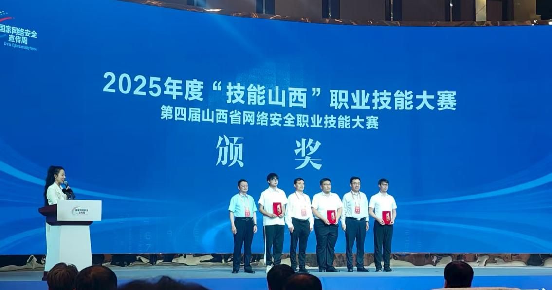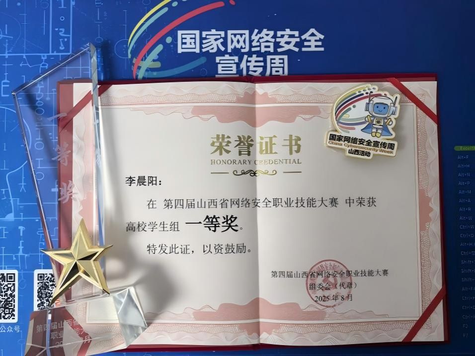 其中,李晨阳同学以高校组总分第一名的优异成绩脱颖而出,并受邀参加2025年度国家网络安全宣传周山西活动启动仪式。同时,根据大赛奖励办法,将由省人社厅报请省人民政府授予“三晋技术能手”荣誉称号。